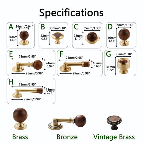 Brass Closet Handles with Walnut Wood Balls, Drawer Knobs/Pulls, Antique Style Brass Cabinet Handles/Pulls, Home Deco Handles